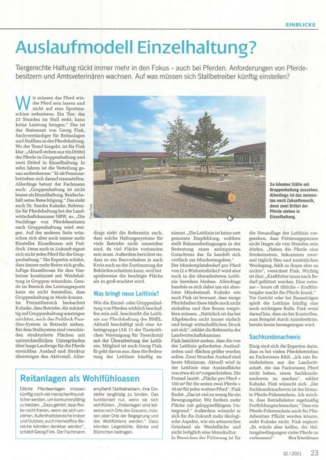 Tiergerechte Haltung rückt immer mehr in den Fokus - auch bei Pferden. Anforderungen von Pferdebesitzern und Amtsveterinären wachsen. Auf was müssen sich Stallbetreiber künftig einstellen? Dies hat Alina Schmidtmann in der aktuellen Ausgabe im Interview mit Herrn Georg Fink, Sachverständiger für Reitanlagen und Stallbau in der Pferdehaltung genauer unter die Lupe genommen: hier lesen
