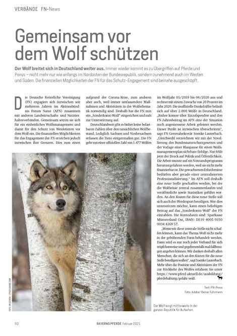 Der Wolf breitet sich in Deutschland weiter aus. Immer wieder kommt es zu Übergriffen auf Pferde und Ponys. In der Ausgabe Februar 2021 der "BAYERNS Pferde" Fachzeitschrift wird über die finanziallen Möglichkeiten der FN berichtet. Den ganzen Artikel lesen Sie hier: hier lesen