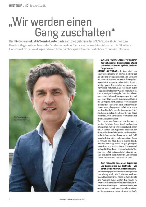 Ein Interview mit FN-Generalsekretär Soenke Lauterbach über die Ergebnisse der IPSOS-Studie hat Frau Monika Schaaf für die Fachzeitschrit "BAYERNS PFERDE" geführt. Den ganzen Artikel lesen Sie hier: hier lesen