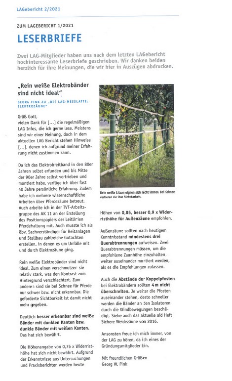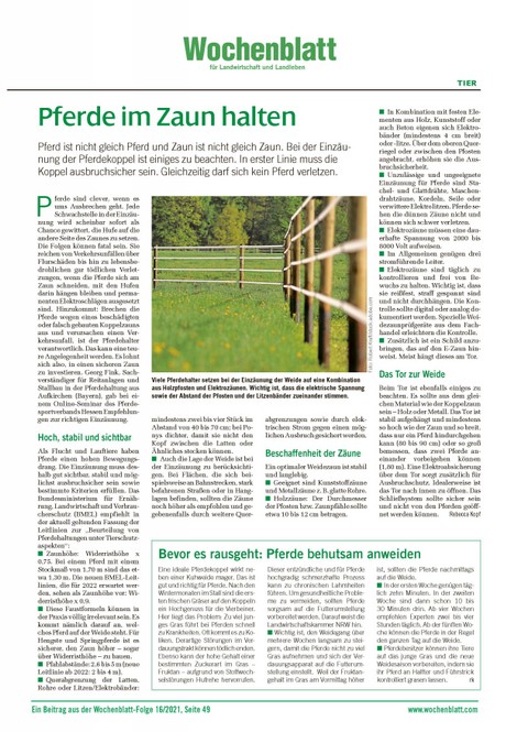 Pferd ist nicht gleich Pferd und Zaun ist nicht gleich Zaun. Bei der Einzäunung der Pferdekoppel ist einiges zu beachten. Frau Rebecca Kopf hat sich mit diesem Theme in der aktuellen Ausgabe des Wochenblattes für Landwirtschaft und Landleben beschäftigt. Den ganzen Artikel lesen Sie hier: hier lesen